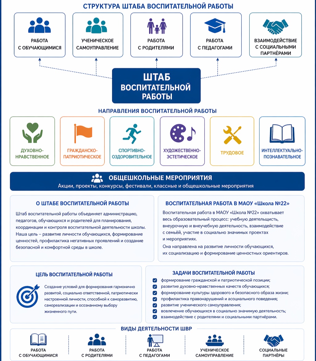 Штаб объединяет администрацию, педагогов, обучающихся и родителей для реализации единой воспитательной системы школы. Работа ШВР направлена на создание благоприятной среды, развитие личности и профилактику негативных явлений